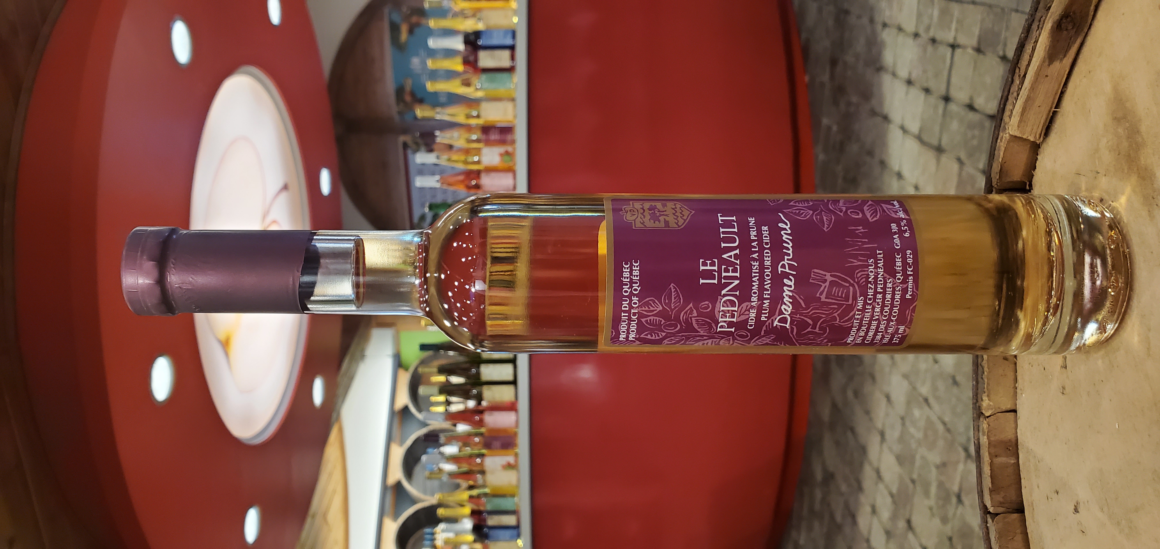 Cidre léger aromatisé à la prune. D'une belle robe éclatante aux reflets oeil de perdrix ce cidre dévoile des arômes de pommes mûres avec de belles notes franches de prunes. Il offre un bel équilibre entre le sucre résiduel et la fraîcheur.