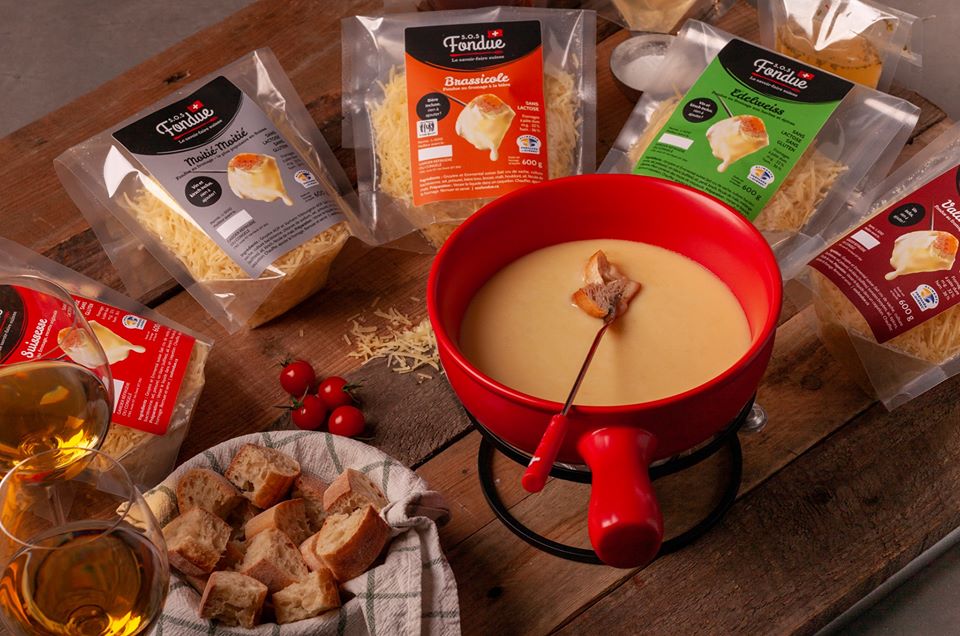 Nos sachets de fondues sont composés d’un mélange de Gruyère et d’Emmental ou de Gruyère et de Vacherin importés de Suisse et accompagnés par un 2e sachet comportant le liquide et l’ail. La fécule de maïs est fournie dans le mélange de fromage. Rien à ajouter, le produit est prêt en cinq minutes!
