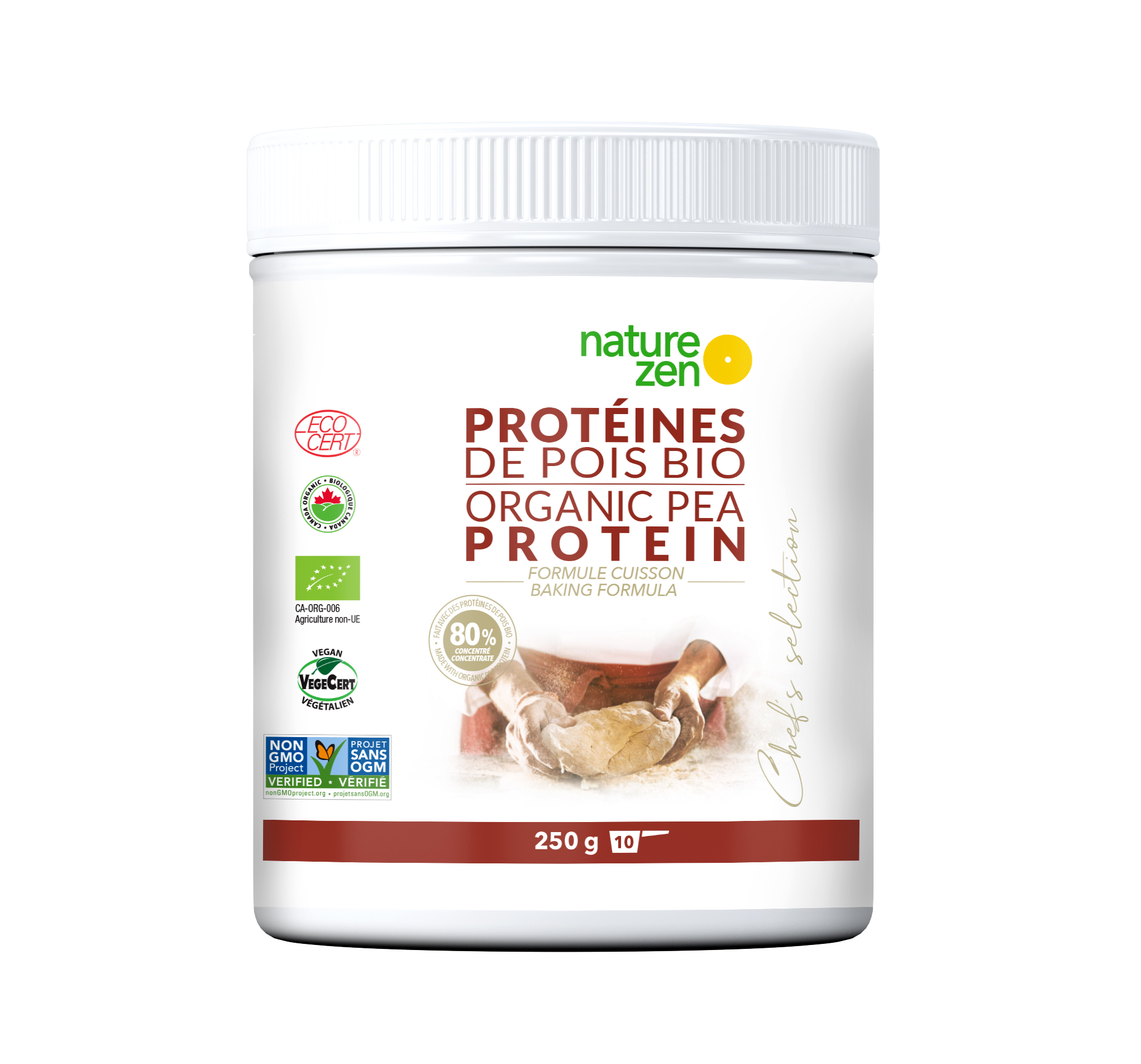 Une formule unique de protéines végétales extraites de pois crus biologiques cultivés en Amérique du Nord, cette protéine biologique convient à notre cuisine quotidienne ; sa longue chaîne d’acides aminés garde tous ses bienfaits à la cuisson. Polyvalente et complète, elle s’ajoute facilement aux plats et préparations crues et cuites, sucrées et salées. La protéine de pois peut en partie remplacer la farine dans les pains, desserts, etc. Une véritable révolution culinaire !