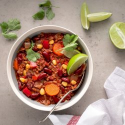 Chili doux, style végétarien, sans viande, sans cholestérol, cuit au four lentement et ne comprenant que des ingrédients de première qualité : haricots (rouges, blancs, pinto), tomates, poivrons, carottes, oignons...