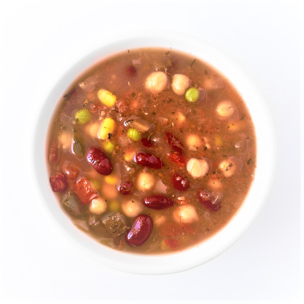 Tomates, pois chiches, fèves rouges, pois verts, maïs en grains, zucchinis, poivrons rouges, aubergines, oignons, sirop d'érable, épices, fines herbes, jus de citron, huile de canola, beurre, ail, bouillon de légumes, eau, sel, poivre.