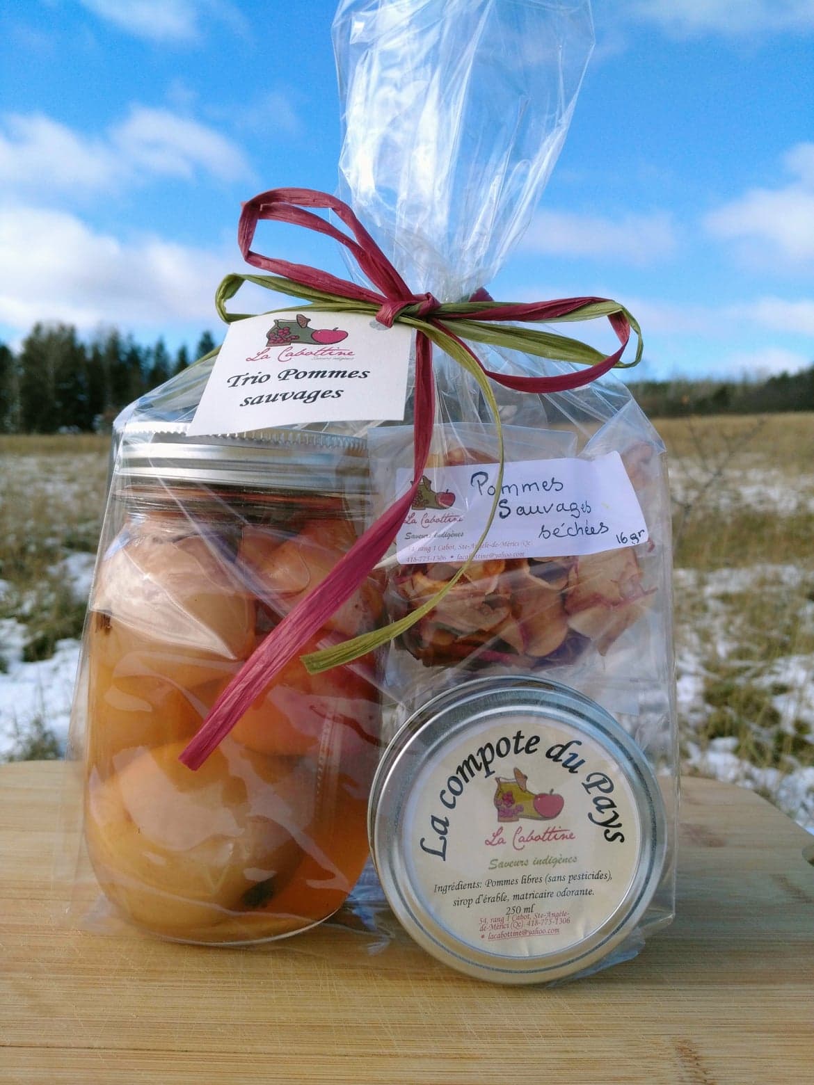 A tomber dans les pommes sauvages des bois! Trio composé de petites pommes confites dans le sirop (500ml), compote du pays (250ml) et des pommes séchées… Un délice…