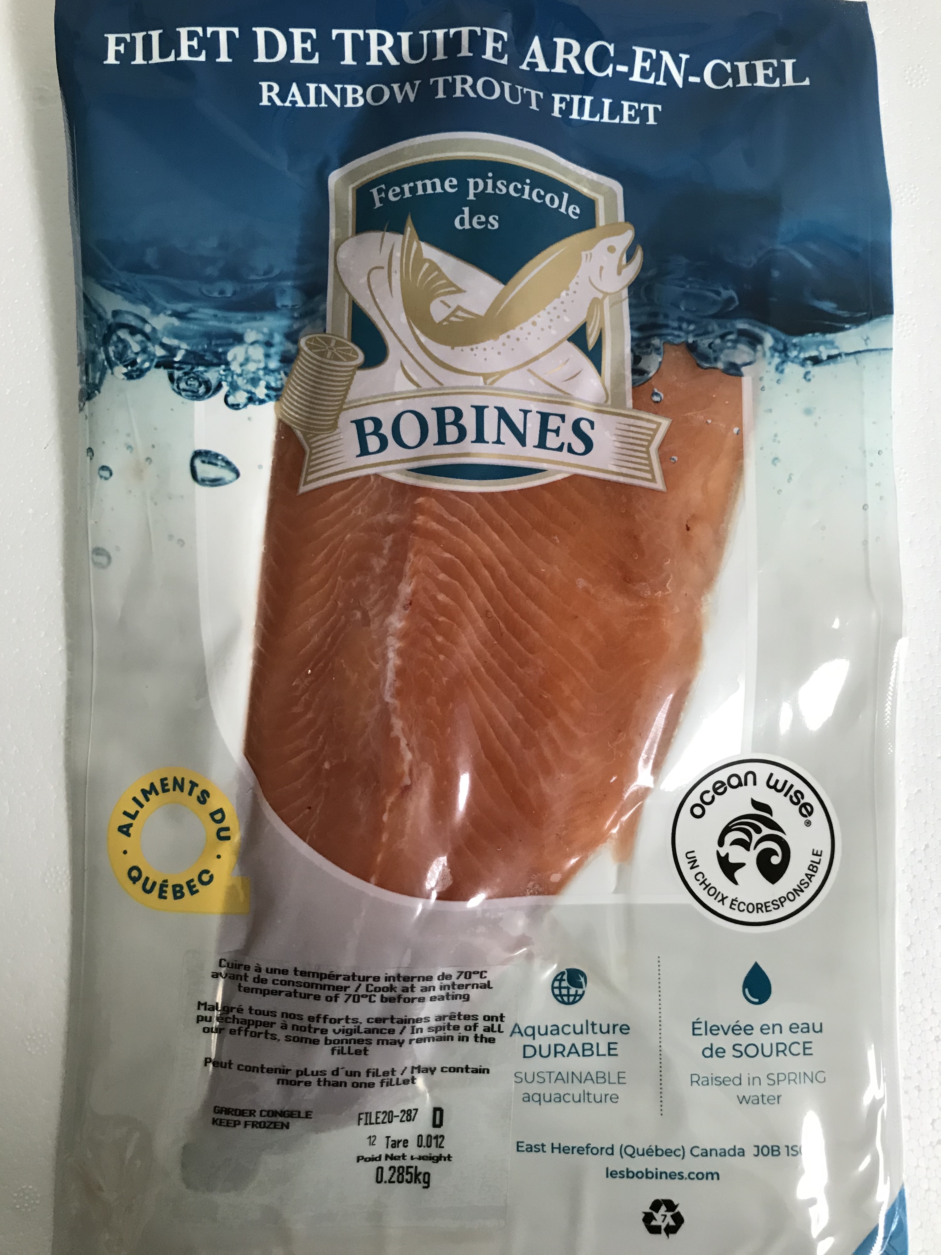 La Ferme piscicole des Bobines opère le plus important site d’élevage de truite arc-en-ciel au Québec et transforme directement ses produits sur place dans une usine certifiée HACCP. Située dans le décor champêtre d'East Hereford en Estrie, notre entreprise est partenaire officiel d'Ocean Wise, un organisme voué à la promotion de l'aquaculture durable. Élevée en eau de source, sans antibiotique ou hormone, notre truite est réputée pour son goût délicat et pour sa qualité exceptionnelle.