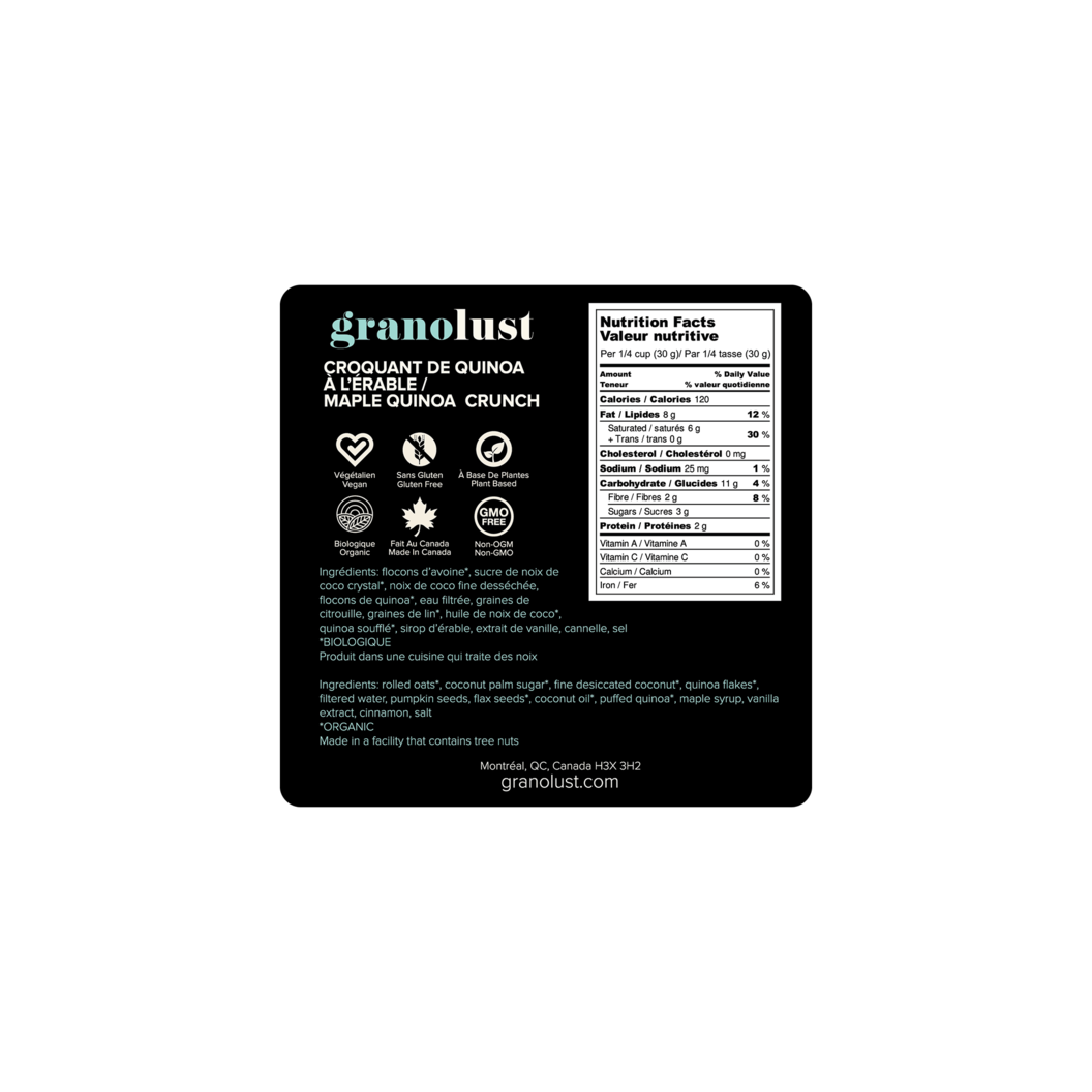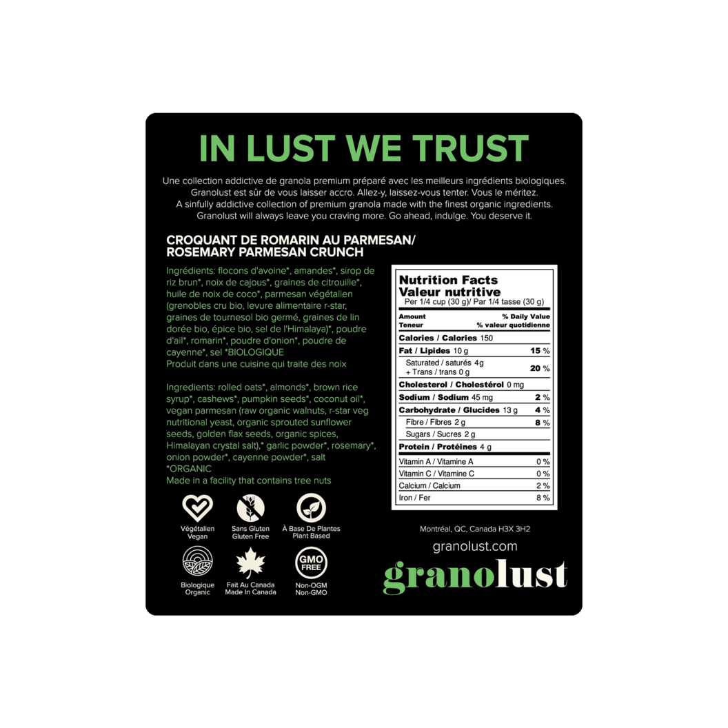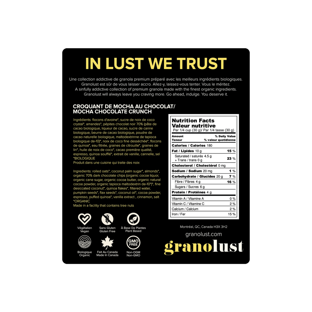 Granolust est une collection addictive de granola de première qualité préparé avec les meilleurs ingrédients tout-naturel, végétalien et sans gluten. À base de plantes et sans OGM, Granolust est fait au Canada, ce qui le rend encore plus sexy. Cédez à vos envies sans culpabilité. Mais soyez prévenu : Granolust est HAUTEMENT ADDICTIF. Une fois que vous y aurez goûté, vous ressentirez le besoin physique d’en avoir plus. Alors ne vous retenez pas. Dévorez-le. Vous le méritez. Nous savons que vous en voudrez encore. Et encore.