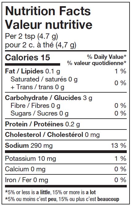 Amidon de maïs, Sel minéral, Farine de maïs, Légumes déshydratés (oignons, tomates), Sucres (maltodextrin, sucre de canne, solides de glucose), Extrait de levure, Huile de canola, Colorant (caramel), Arôme naturel, FInes herbes, Acide citrique, Extrait d'épices.