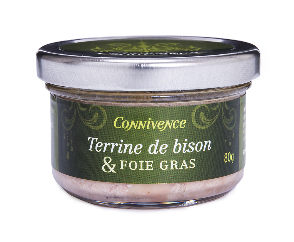 Ingrédients: Bison, porc, foie gras de canard ( 17 à 20% ), eau, oeufs, gras de porc, fécule de maïs, oignons, sel, gélatine, poivre, sucre, épices. Peut contenir des arachides et noix (épices). Sans Gluten. Réfrigérer après ouverture.