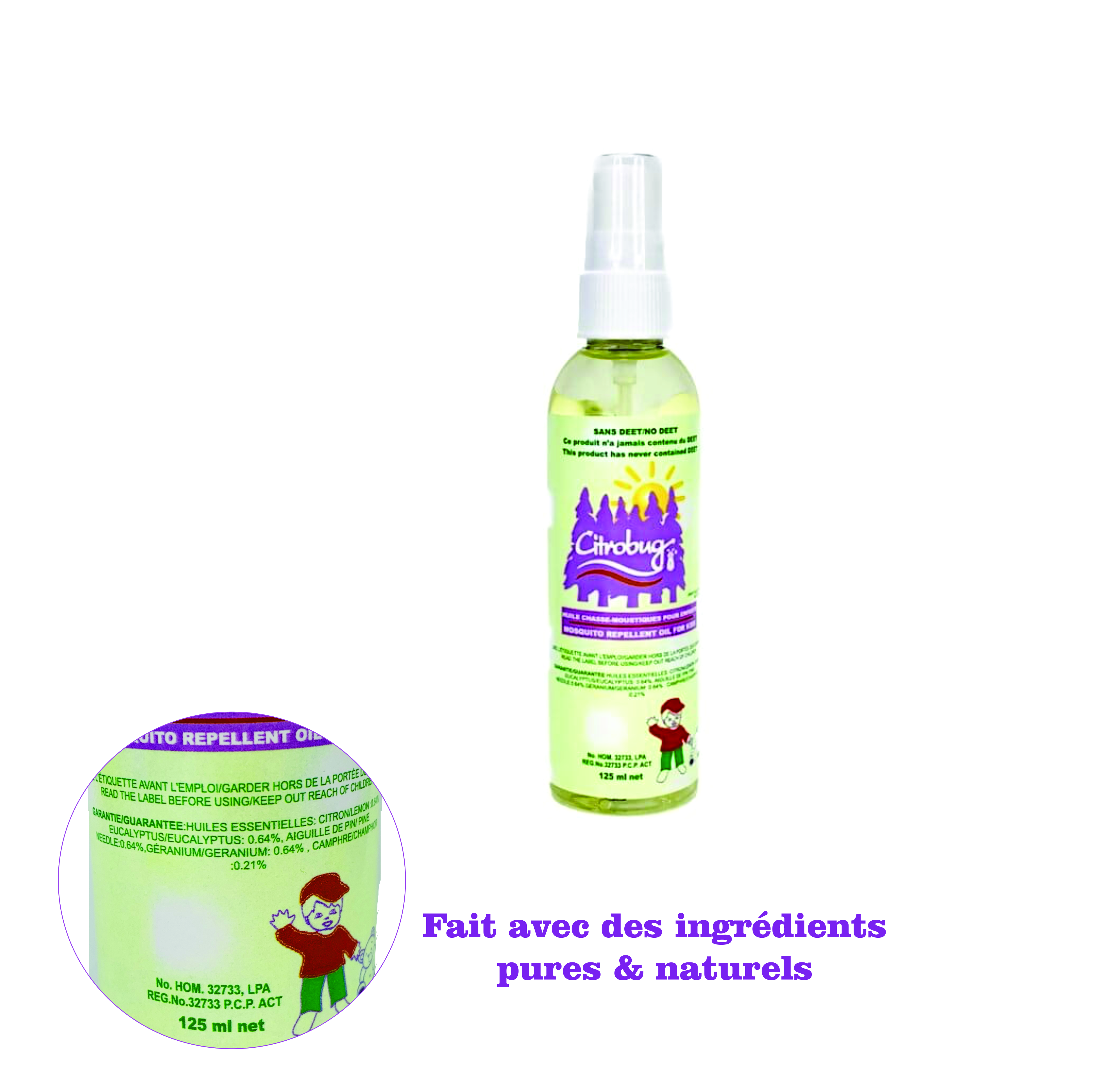 Notre produit a été recommandé par les spécialistes de la santé, car notre formule unique n'inclut ni molécules synthétiques, ni de DEET. Notre chasse-moustiques Citrobug pour enfants est idéal pour les vacances, les camps de jours, le camping en famille et les randonnées en forêt. Il est efficace contre les tiques, mouches noires, maringuins, brûlots, etc. Protégez votre enfants de façon sécuritaire.