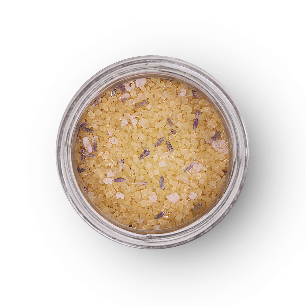Sucre de canne brut, vanille de Madagascar, fleurs de lavande, Cayenne.