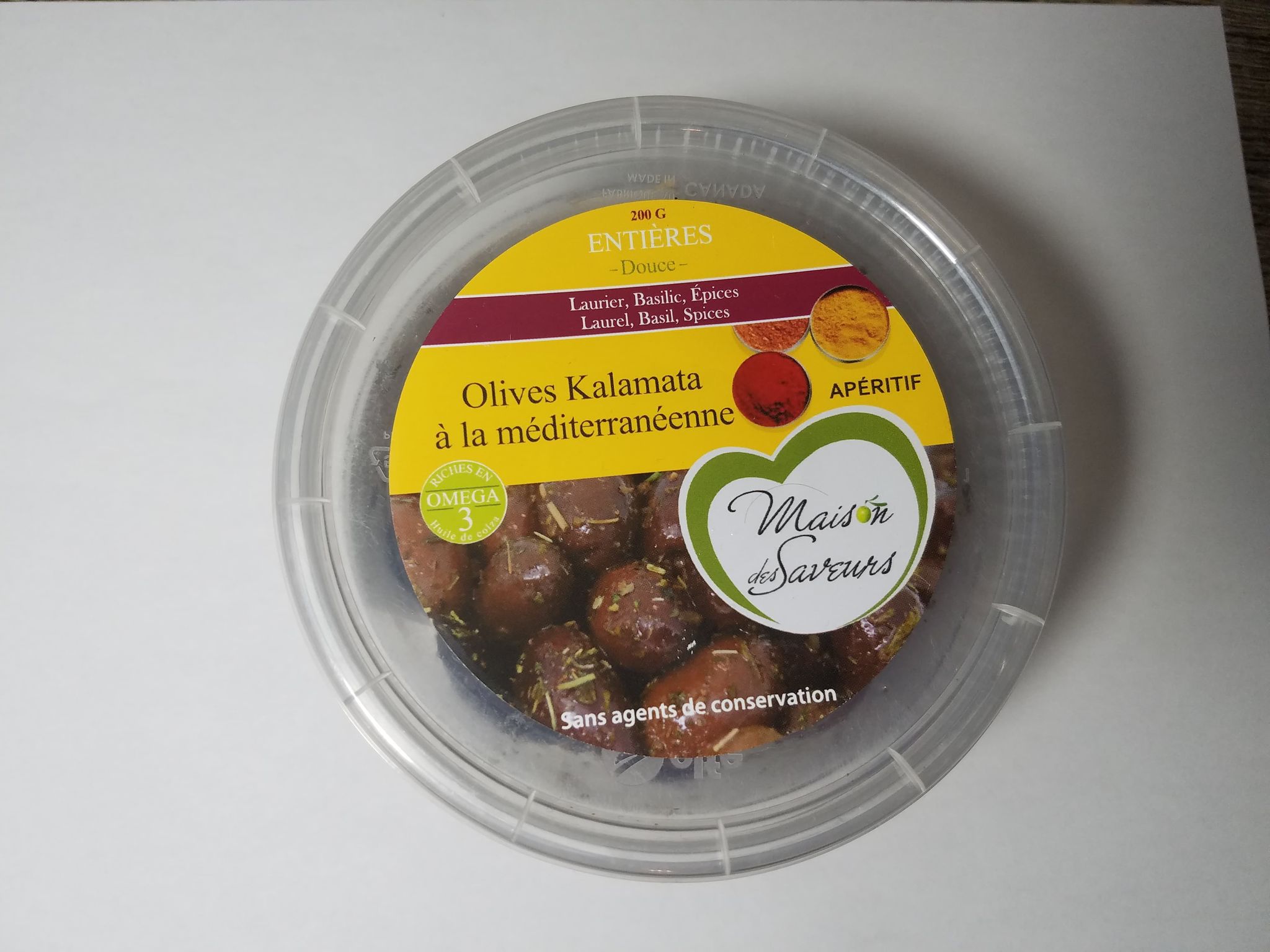 olives kalamata - laurier- basilic - epices- huile de canola