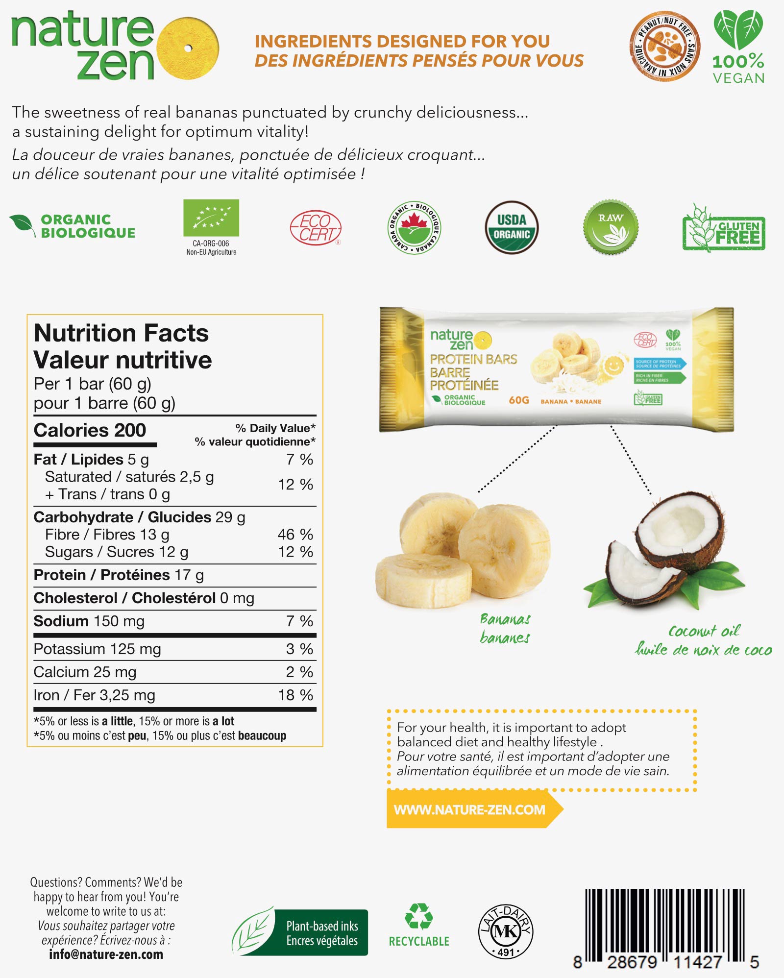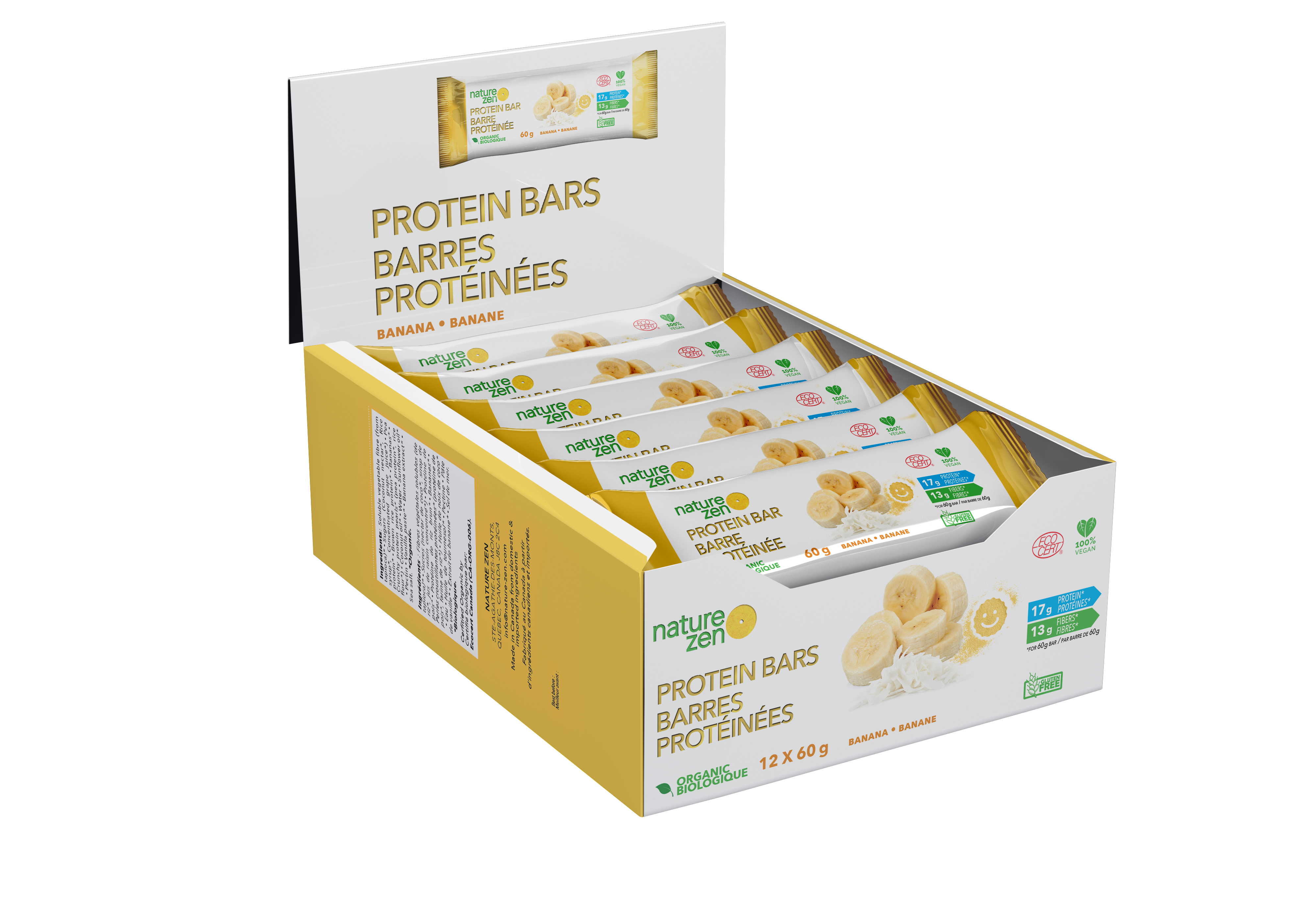 Fibres végétales solubles (de tapioca)*, sucres (nectar de coco*, sirop de riz*, jus de raisin concentré*), protéine de pois*, protéine de riz brun*, bananes*, perles croustillantes protéinées* (protéine de pois*, farine de riz*), huile de noix de coco*, eau, huile de tournesol*, pectine, pâte de vanille*, extrait de banane*, sel de mer. *Biologique. Certifié biologique par Ecocert Canada.