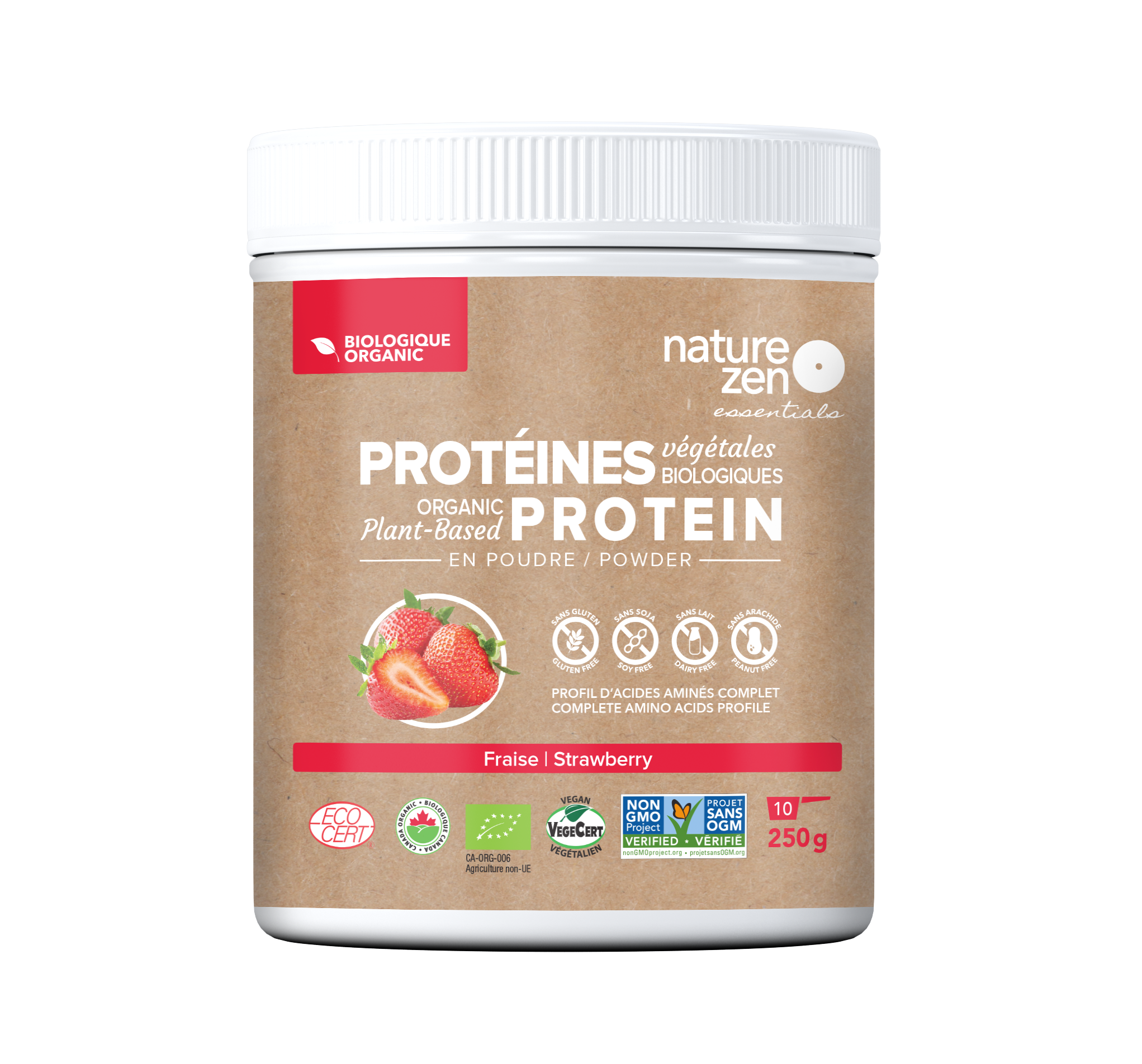 Protéine de pois*, protéine de riz brun germé et fermenté*, fibres végétales de tapioca*, mélange de fruits & légumes en poudre* (pomme*, kale*, brocoli*, épinard*, carotte*, persil*, betterave*, chou vert*, bleuet*, framboise*, fraise*, tomate*), pectine, graines de lin dorées*, poudre de fraise lyophilisée*, poudre de riz*, lécithine de tournesol, poudre de citron*, sel rose de l’Himalaya, stevia*, saveurs naturelles*. *Biologique. Certifié biologique par Ecocert Canada.