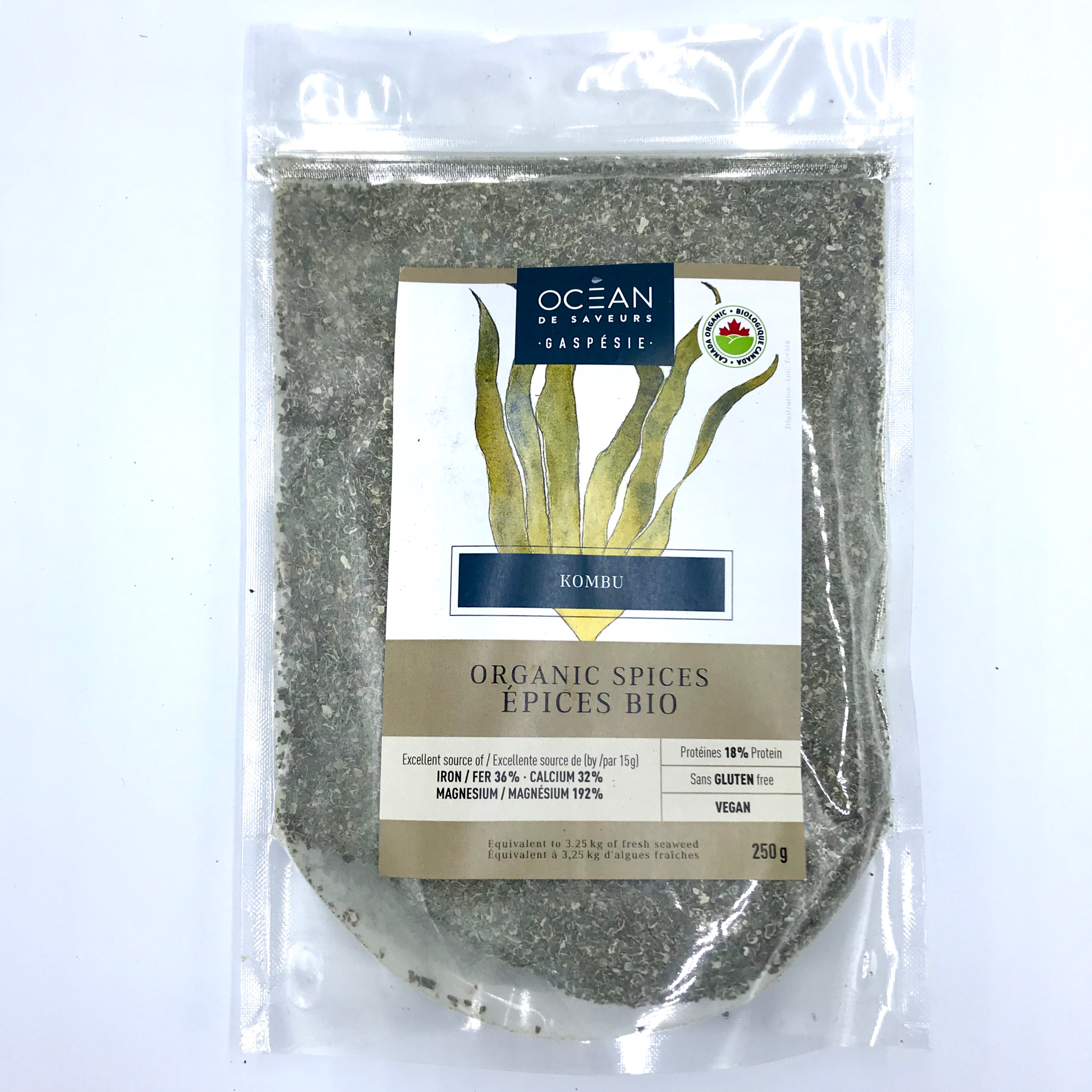 En plus d’être faible en sodium, le Kombu est sans gluten, sans gras et sans cholestérol. Excellente source d’antioxydant et détoxifiant pour les métaux lourds, ce légume de mer est aussi riche en iode, ce qui aide à réguler et tonifier votre métabolisme, à renforcer votre système immunitaire, contribue au bon développement de votre cerveau et au bon fonctionnement de votre glande thyroïde. Ne contient aucun additif, aucun agent de conservation et aucun agent de remplissage, uniquement des algues.